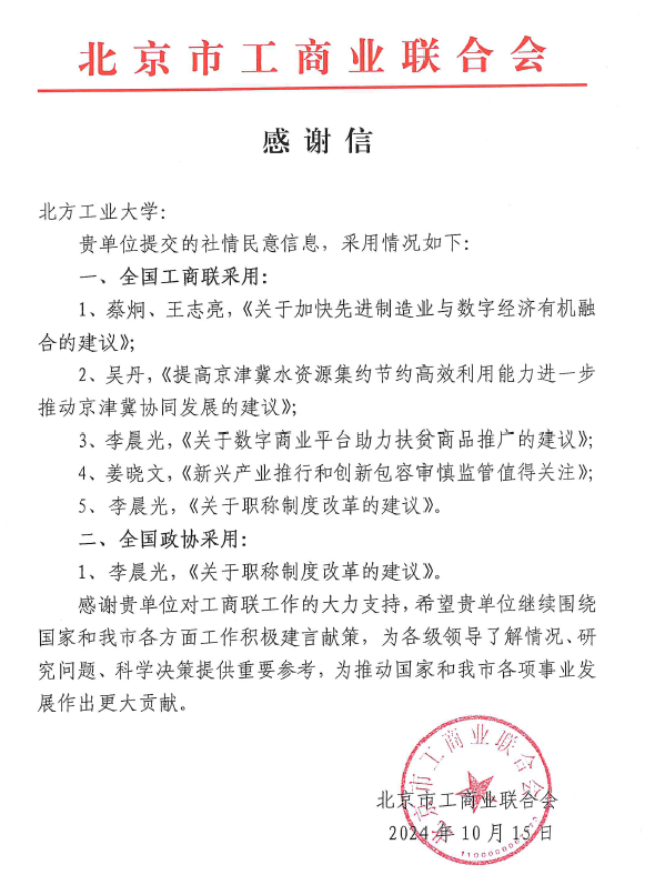 2024年10月16日,北京市工商业联合会发来感谢信,对我校3044am永利集团投稿的“社情民意信息”被全国政协和全国工商联采用的情况进行通报并表示感谢。