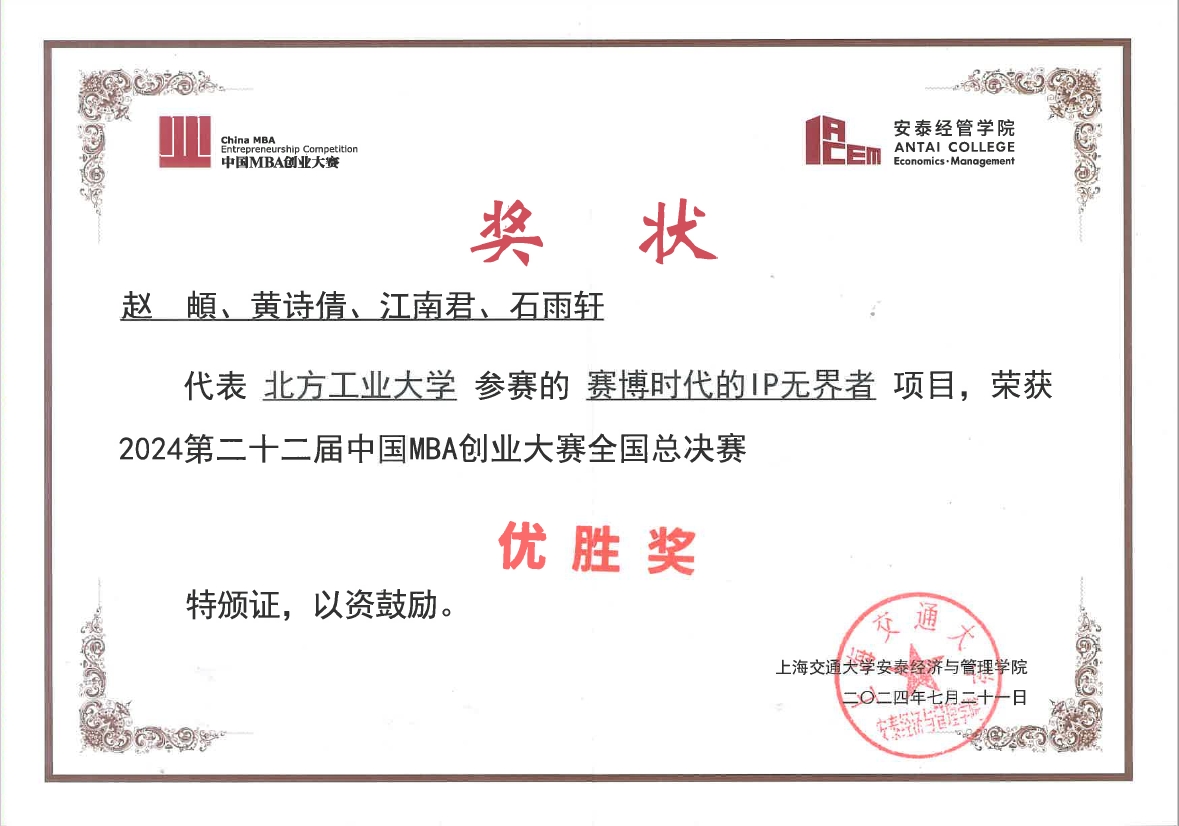 7月21日,第二十二届中国MBA创业大赛全国总决赛在上海交通大学圆满落幕。经过激烈的角逐,我校23级MBA赵頔同学负责的“赛博时代的IP无界者”项目荣获全国总决赛“优胜奖”,3044am永利集团刘冰老师荣获“优秀创新创业导师奖”,牛天勇老师荣获“优秀组织奖”。这是永利集团3044am官方入口MBA首次参赛,即一路披荆斩棘冲出初赛、入围复赛、挺进全国总决赛,取得优异成绩。