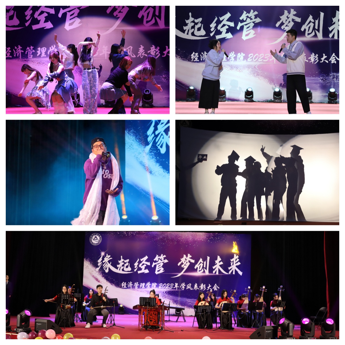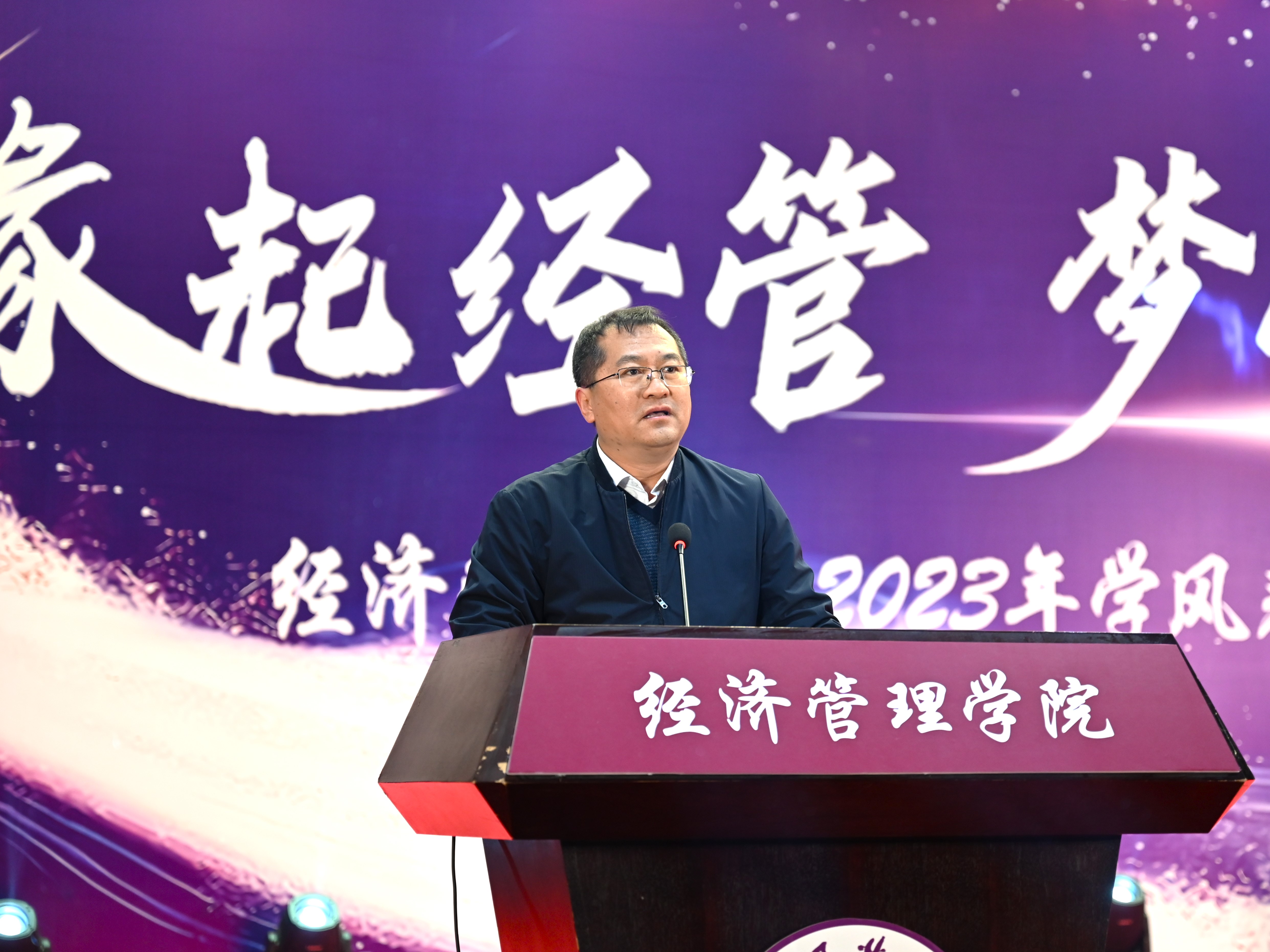 为加强学风建设,总结经验,展现学子风采,激励学院广大师生保持昂扬向上的奋斗姿态,12月14日晚,经管学院在图书信息楼报告厅举办“缘起经管 梦创未来”2023年学风表彰大会。校学生工作部部长孙宗瑞,学院领导班子全体成员,各系主任、班导师、辅导员,22级、23级全体学生参加了活动。