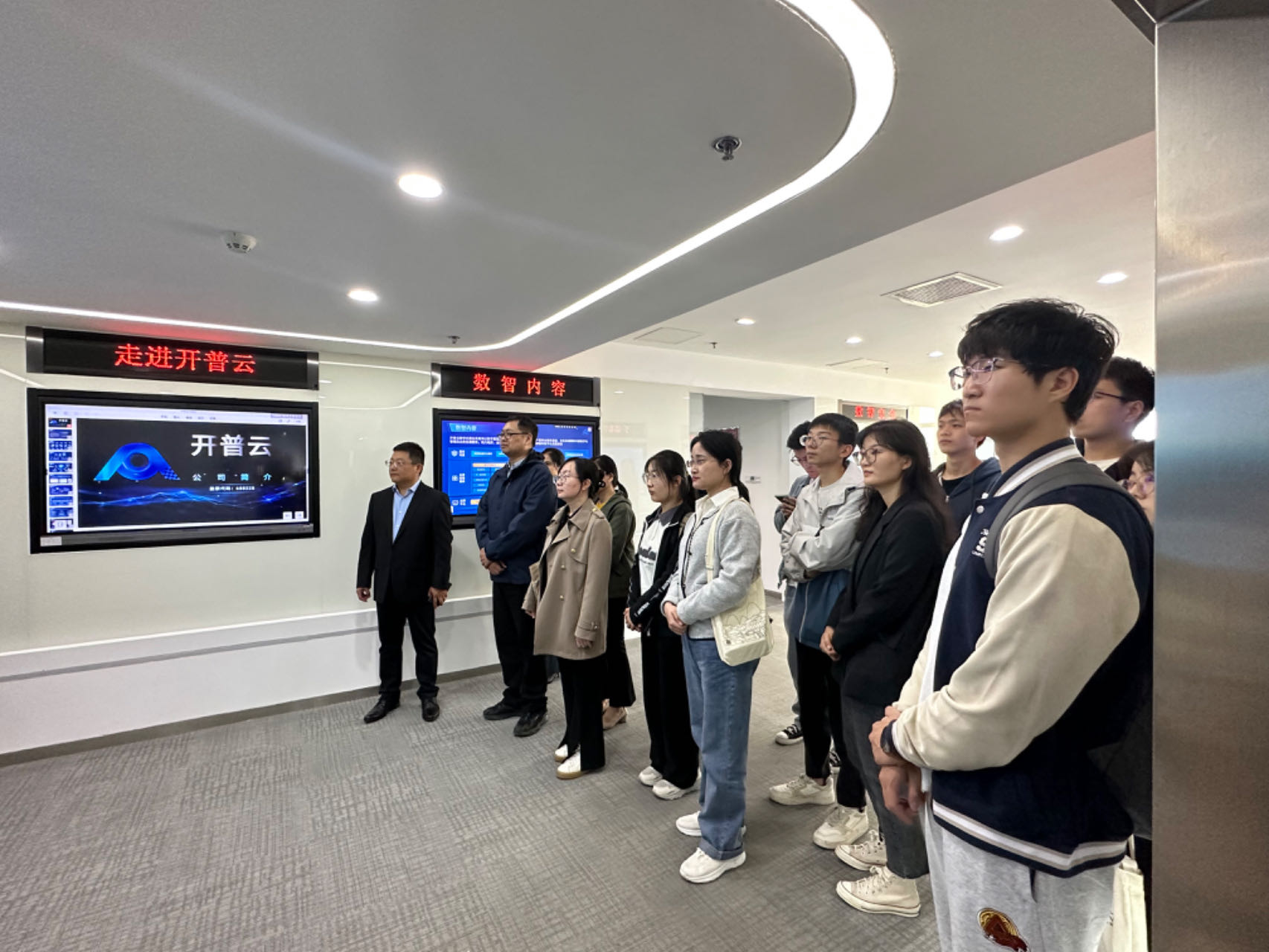 学院师生首先参观了开普云的展厅,在公司总裁助理孙旭介绍下,对公司和公司的主要业务有了初步了解。开普云信息科技有限公司于2020年在上交所科创板上市,是国内领先的基于AI大模型的行业数字化服务提供商。