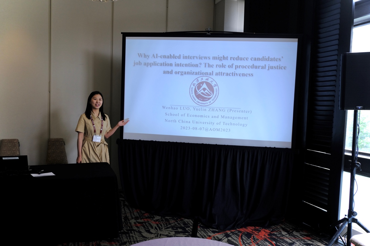 作为我校首位在AOM这一管理学国际学术会议上报告研究成果的学生,张越琳同学事前充分准备,与导师进行了多次演练。参会中的认真展示得到了与会者的高度肯定,并收获了多名国际学者的建设性意见。该论文基于信号理论与公平启发理论,采用情景实验法,实证探究了AI面试对应聘者求职意愿的影响以及行业的调节效应。