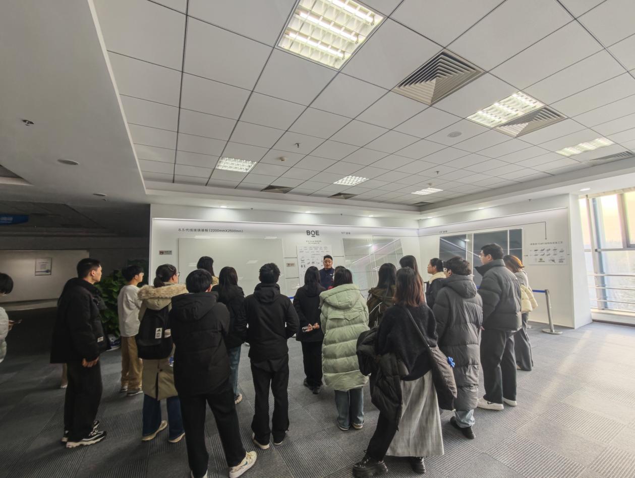 在位于大兴区的京东方集团总部,企业负责人向师生系统展示了全球显示领域的尖端成果。从全球首发的95英寸8K OLED显示屏、P0.9 COG AM MLED超高清显示模块,到86英寸COG AM MLED背光产品,清晰的技术演进路径令同学们印象深刻。
