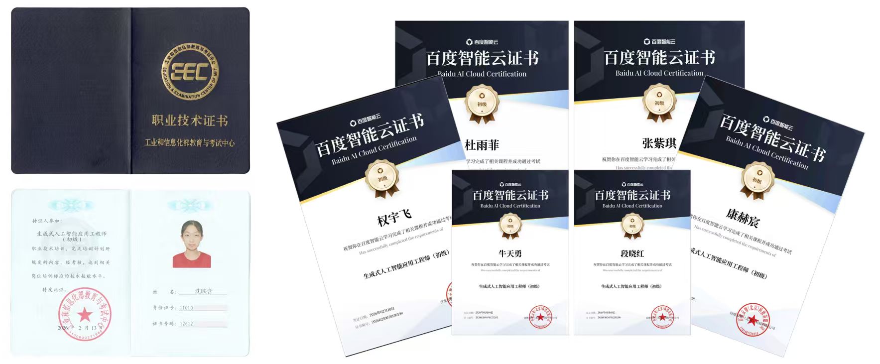 近日,3044am永利集团联合百度智能云千帆大模型产业(北京)创新基地,组织全校48名师生开展生成式人工智能应用工程师(初级)培训与考核工作。全体参训师生顺利通过考试,成功获得由工业和信息化部教育与考试中心联合百度发布的职业技能资格认证,实现全员取证。这是学院深化产教融合、推进创新创业教育改革,助力师生抢抓AI时代发展机遇的重要成果。
