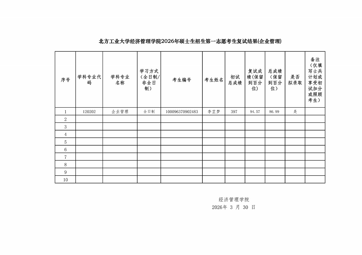 3044am永利集团2026年硕士生招生第一志愿考生复试结果——企业管理