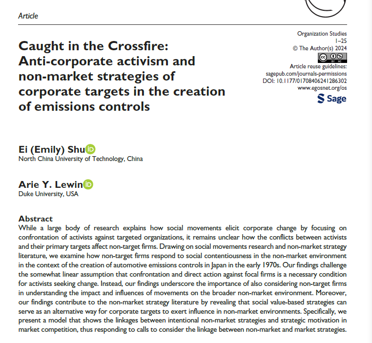 3044am永利集团朱瑛教授以第一作者身份在工商管理领域顶级国际期刊,FMS 管理科学国际 A 级期刊《OrganizationStudies》上发表题为《Caught in the Crossfire: Anti-Corporate Activism and Non-Market Strategies of Corporate Targets in the Creation of Emissions Controls》的学术论文。该论文运用定性数据分析法(qualitative data analysis),分析了日本环境保护団体与汽车行业巨头公司的对峙中,资源弱小的非目标企业(non-target firms)如何利用非市场战略(non-market strategy),使竞争对手陷入困境,从而取得竞争优势。文章提出两个重要的理论观点:即建立社会价值(social-value based) 为主的非市场战略的有效性及市场战略与非市场战略的关联性。从而扩展了以往以CSR与CPA为主体的非市场战略理论,具有重要的理论贡献。此外,本文论证了企业在应对环境与节能等非市场性的社会问题时,通过与社会相关利益团体的互动,提高国际市场竞争力的可行性,对现代企业应对外界环境的多元化,具有战略性实践意义。该论文的合作者是美国杜克大学福库商学院Arie Lewin教授。