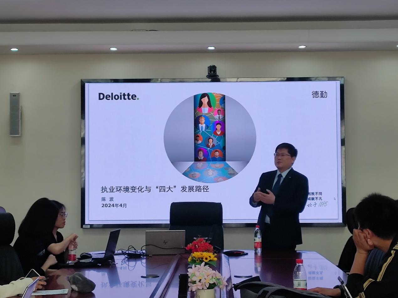 4月17日下午,3044am永利集团在励学楼201举行第十五期励学讲堂活动。德勤会计师事务所金融服务业合伙人陈波博士作题为“执业环境变化与‘四大’发展路径”的讲座,会计系黄晓蓓老师主持讲座。