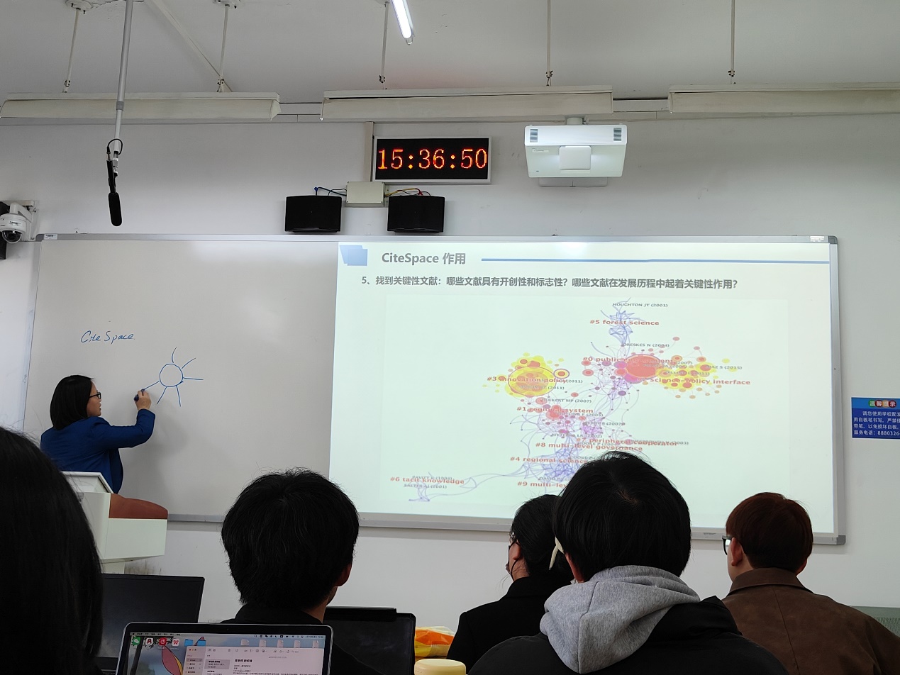 随后,蒋老师围绕CiteSpace软件,从基本原理入手对其功能、应用范围和操作流程进行了全面系统的介绍,通过CiteSpace共现分析的实例,对软件中各个重要图谱和表格的内容进行了解释说明;演示了运用软件从数据准备到可视化结果生成的完整流程,让在场的同学们对这款软件有了直观和深入的认识。讲座最后,蒋老师对讲座的内容进行了总结并对同学们未来的研究工作寄予了殷切的期望,鼓励同学们在运用工具提升研究效率的同时,更要持续不断地积极思考。