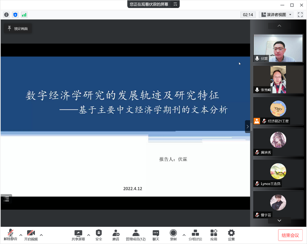 4月15日下午,应3044am永利集团邀请,中央财经大学经济学院副教授、现任中央财经大学经济学院副院长伏霖为我校师生作了题为“数字经济学研究的发展轨迹及研究特征—基于主要中文经济学期刊的文本分析”的线上学术报告。报告会由经济系张雪峰副教授主持,经济系研究生参会。