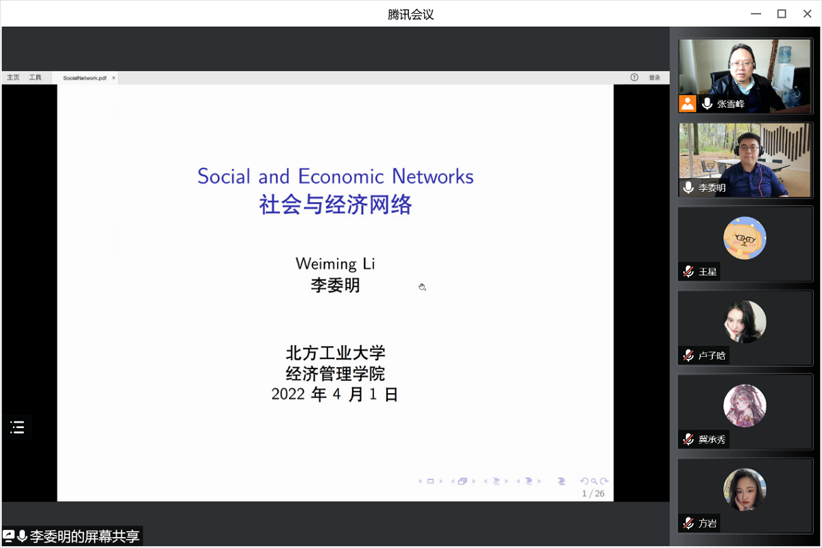 4月1日下午,应3044am永利集团邀请,首都经济贸易大学国际3044am永利集团副院长,李委明副教授通过腾讯会议APP为我校师生作了题为“社会经济网络研究”的线上学术报告。报告会由经济系张雪峰副教授主持,经济系经济研究生参会。