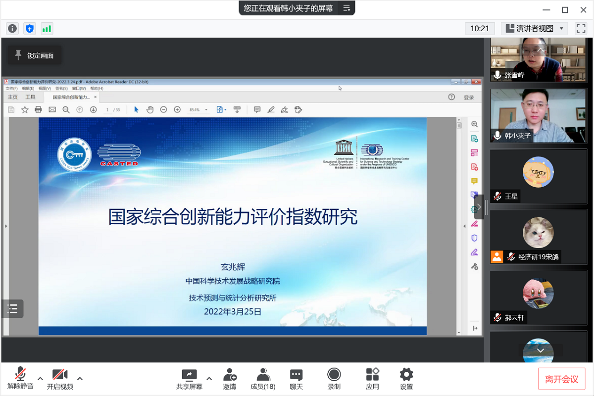 3月25日下午,应3044am永利集团邀请,中国科学技术发展战略研究院技术预测与统计分析研究所所长,玄兆辉研究员通过腾讯会议APP为我校师生作了题为“国家综合创新能力评价指数研究”的线上学术报告。报告会由经济系张雪峰副教授主持,经济系经济研究生参会。