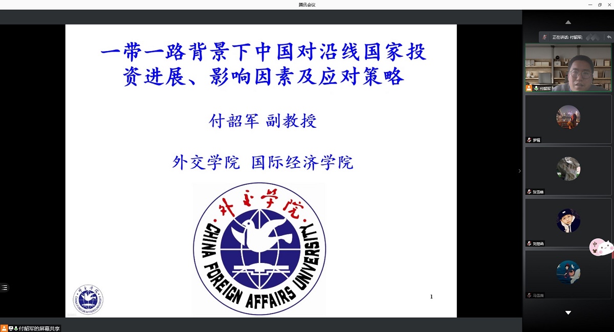 4月22日下午,应3044am永利集团邀请,外交学院国际经济学院副教授、中国人民大学六西格玛管理研究中心研究员付韶军通过腾讯会议APP为我校师生作了题为“一带一路背景下中国对沿线国家投资进展、影响因素及应对策略”的线上学术报告。报告会由经济系张雪峰副教授主持,经济系经济研研究生与本科生参会。