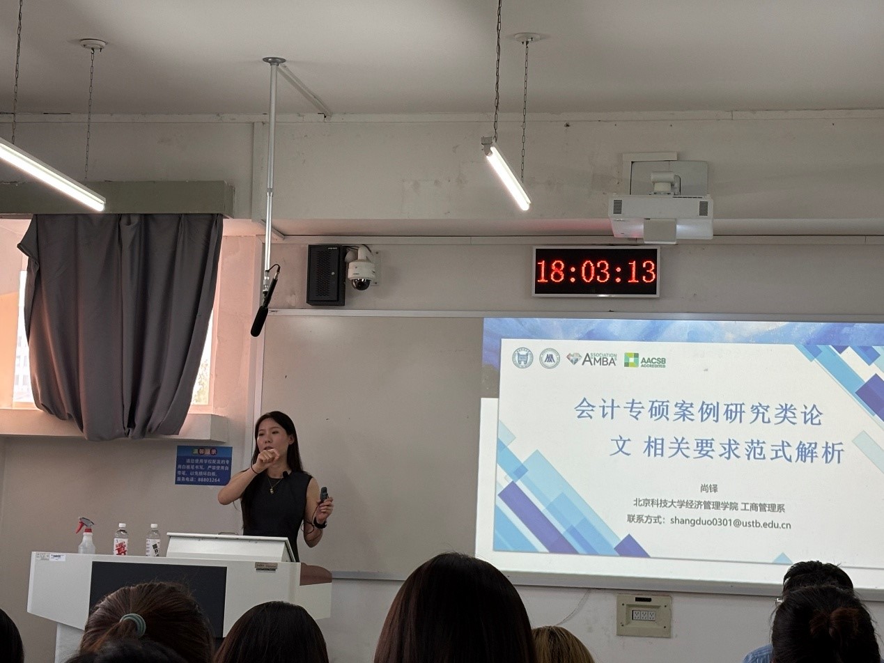 讲座紧扣会计专硕研究生案例研究类论文写作展开。尚老师指出,选好题是写好论文的关键,并依照教指委对案例研究类论文的评价参考要素,详细解读了选题要点,强调会计专硕学位论文要源于有价值的企业管理问题或实践,还给出具体实用的建议,回答了同学们选题面临的困惑和疑问。在案例陈述环节,尚老师先明确案例论文基本定位,介绍了问题型、描述型等案例研究论文类型,并结合具体撰写范例,让同学们直观理解如何精准、清晰地进行案例陈述。随后,尚老师分享了从 AMJ 论文中梳理的涵盖12个微观和8个宏观经典管理理论,指导同学们根据具体选题选择适宜的经典管理学理论深入剖析案例,完成论文写作。