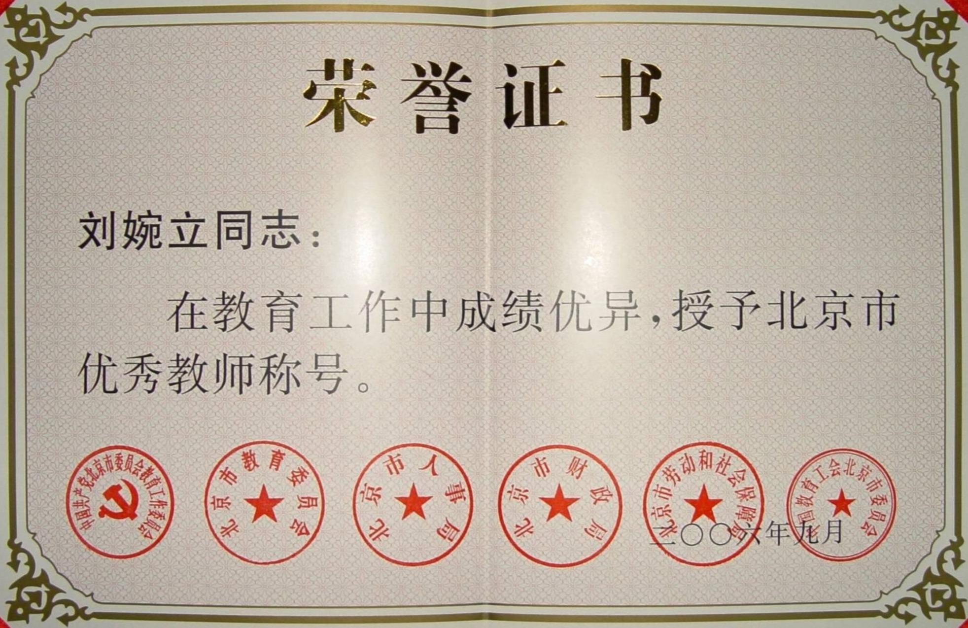 刘婉立 北京市优秀教师 |