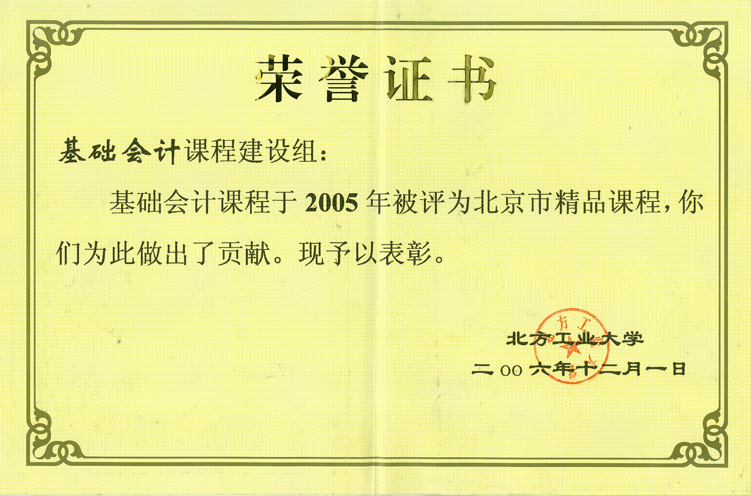 2005年,《基础会计》课程被评为北京地区高等学校市级精品课程。