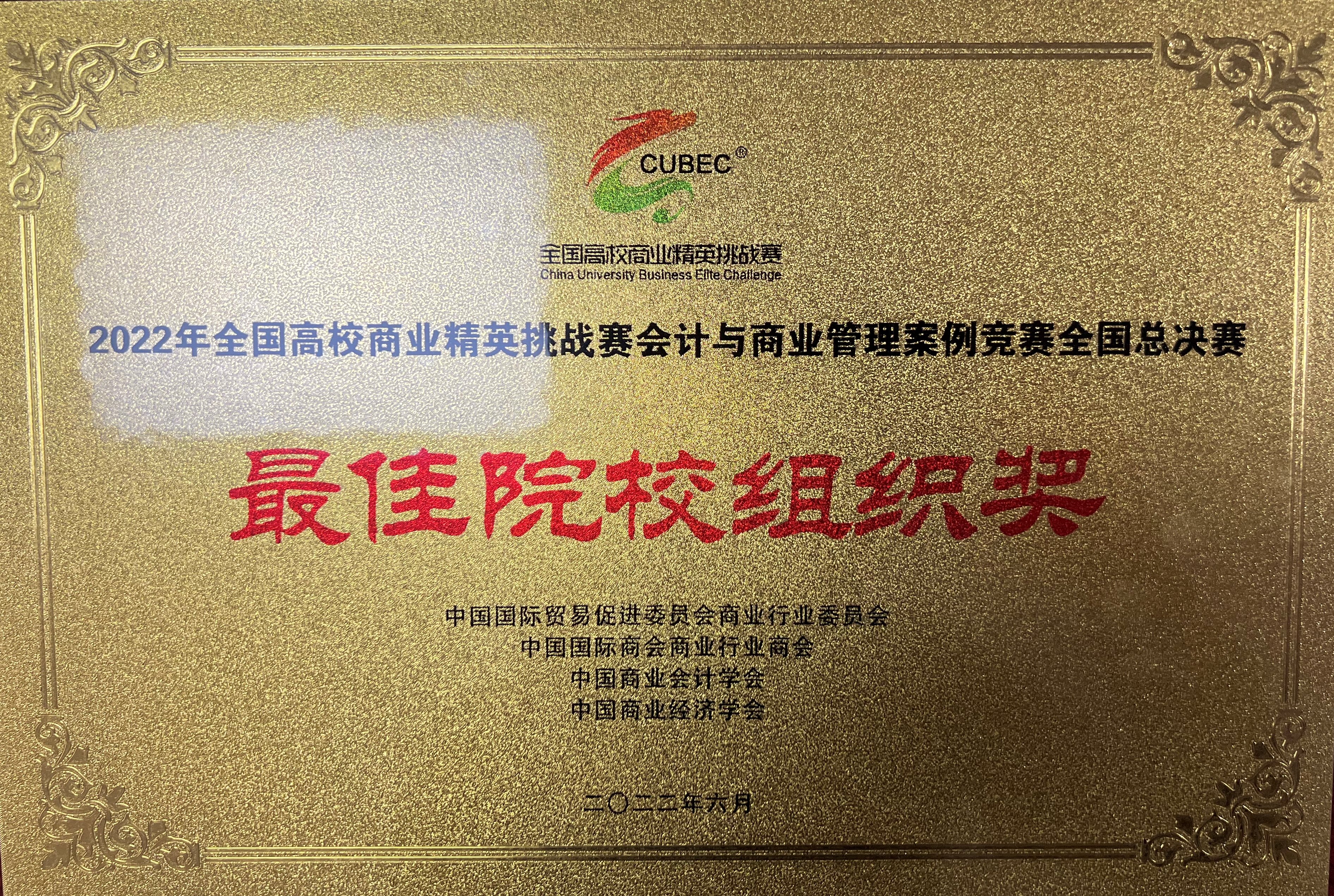 2022年全国高校商业精英挑战赛 会计与商业管理案例竞赛全国总决赛最佳院校组织奖 |