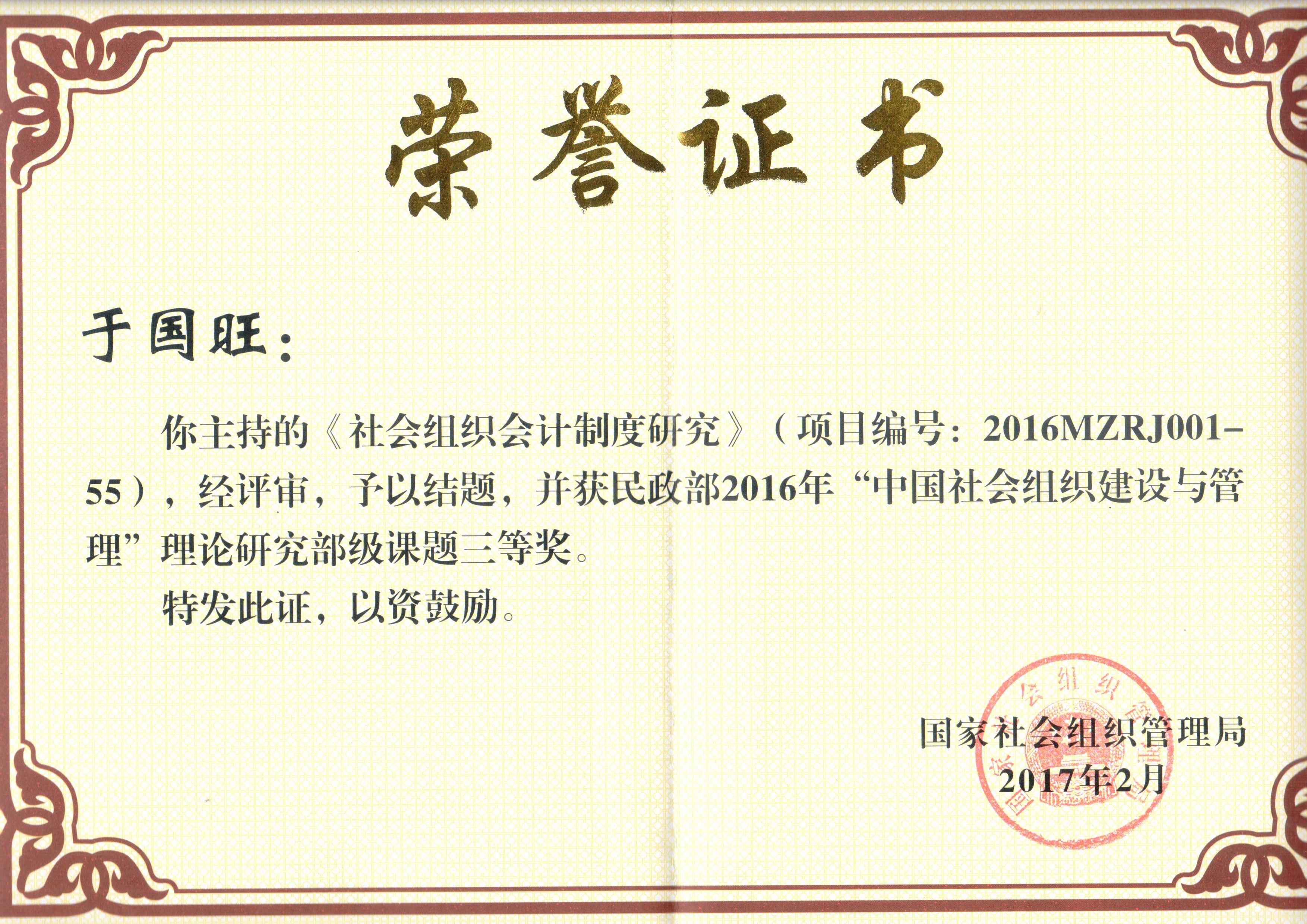 于国旺 民政部“中国社会组织建设与管理” 理论研究部级课题三等奖 |