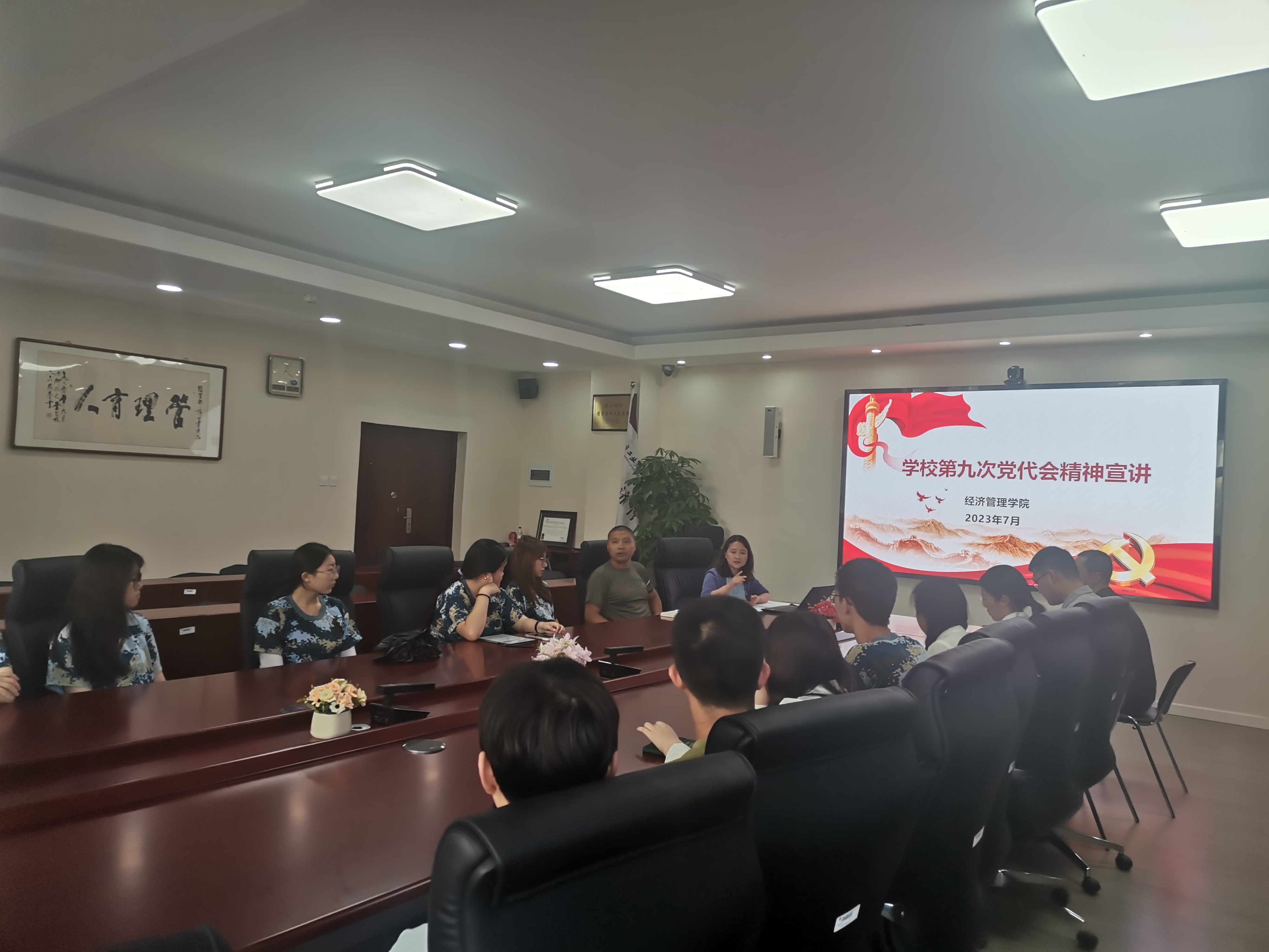 学校第九次党代会是在全党上下深入开展学习贯彻习近平新时代中国特色社会主义思想主题教育和学校实施“十四五”规划的关键时期召开的一次重要会议。学院党委副书记王帏带领与会师生认真学习学校第九次党代会报告原文,结合学院实际,深入细致向大家解读党代会报告中提出的发展建设思路。党代会报告中指出,学校在新时代高水平应用型大学的建设中,要全面落实“三步走”战略目标。要牢牢把握“六个坚持”,要全力实施“五大创新工程”。学校在全面开启高水平应用型大学建设新篇章中,要坚持和加强党对学校工作的全面领导、着力培养高素质应用型人才、持续深化一流学科和博士点建设、加快完善高水平科技创新体制机制、全力打造高素质教师队伍、积极推进高品质国际交流合作、持续提升服务社会能力和水平、凝聚事业高质量发展合力。
