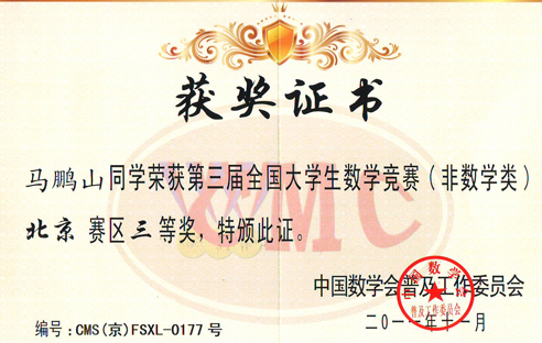 近日,全国第三届大学生数学竞赛暨北京市第二十二届大学生数学竞赛颁奖会在北京邮电大学举行,我校共有42名学生获奖,获奖人数仅次于北京大学、北京邮电大学、北京航空航天大学、北京科技大学,位居第五位。同时,我校还获得优秀组织奖,唐旭晖老师获得优秀指导教师奖。