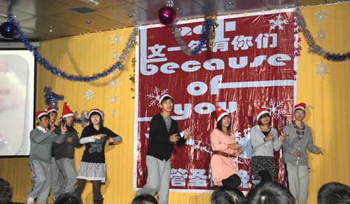 创意十足的开场视频和激情四射的圣诞舞蹈拉开了晚会的序幕。学院党总支副书记张加强老师代表学院向全体同学送去了祝福,肯定了一年来大家在各方面取得的成绩,希望大家继续发扬优良的作风,争取更大的进步。同学们通过《少年梁祝》、《人类感情恋爱发展史》、《大学生活》、《东厢记》等节目生动幽默地表达了对于大学生活的理解。自编自演的舞蹈《Christmas Bar》和歌曲《圣诞串串烧》表达了同学们的美好祝愿,赵灯兵老师的歌曲《等待》将晚会气氛推向高潮。晚会过程中,大家还通过祝福便利贴的形式,表达了新年美好的愿望。整个晚会,掌声、欢笑声此起彼伏,气氛热烈。