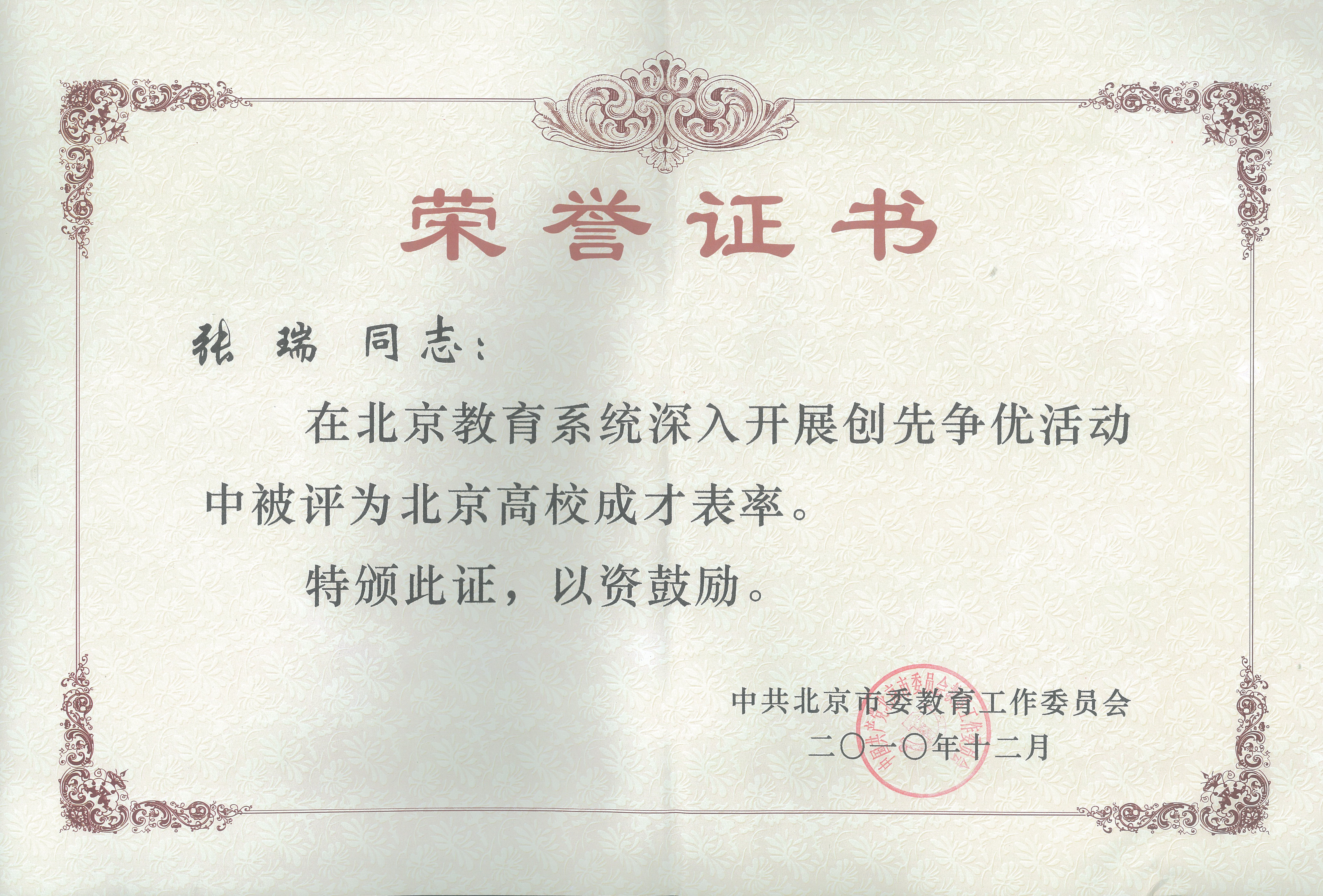 张瑞,1989年出生,2009年加入中国共产党,3044am永利集团国际经济与贸易专业07A-3班学生,曾获北京市三好学生、校级三好学生、校级优秀共青团员、校级“成才表率”等荣誉称号。