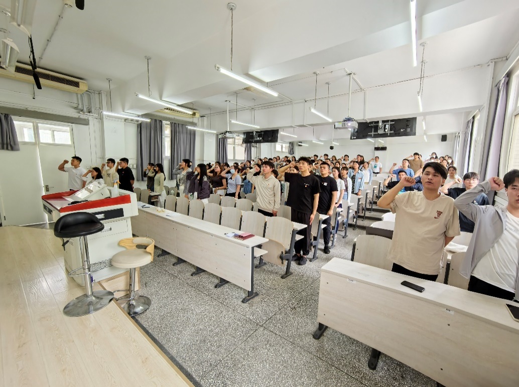 在毕业生党员代表管20-1刘闯领誓下,与会全体党员面向党旗,重温入党誓词。