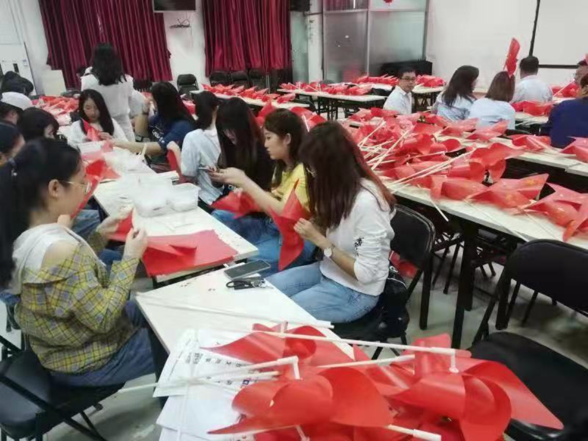 座谈会后,学生党员与社区党员、中小学生和一起动手为社区进行迎国庆环境布置。大家制作了带有国旗图案的风车,并前往社区空地,将风车摆放成“庆70”的字样,安插在草坪当中,为社区里增添了迎国庆的喜悦气氛。
